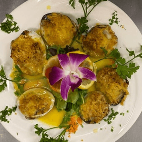 Fresh little neck clams stuffed with Italian seasoning breadcrumbs white wine lemon baked to perfection