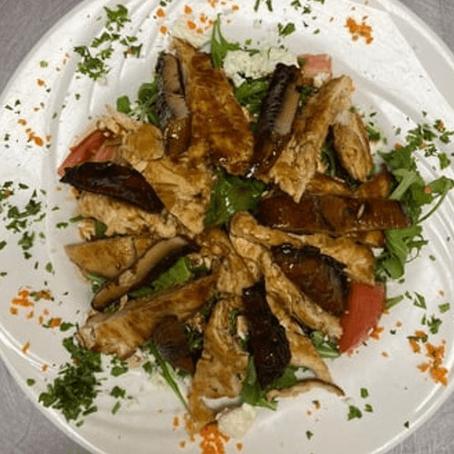 Grilled chicken & portabella mushrooms, feta cheese, arugula, fresh tomatoe, balsamic vinegarette