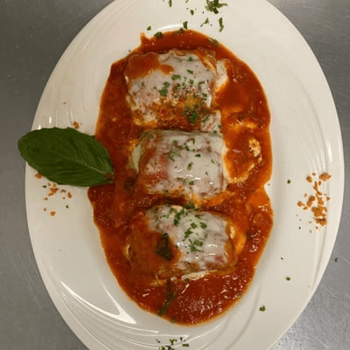 Rolled eggplant stuffed with ricotta, Romano, prosciutto. Topped with tomato sauce and mozzarella cheese